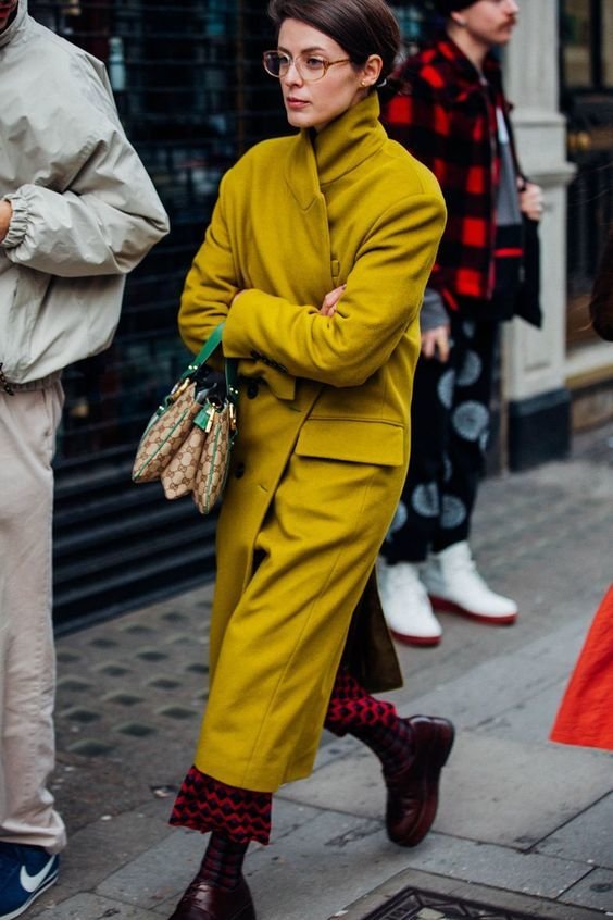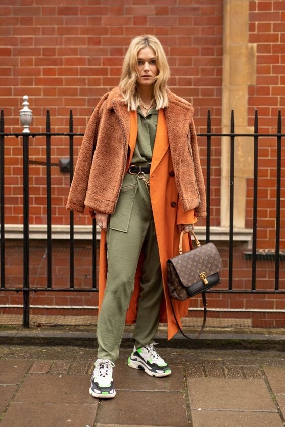 나 멋좀 냈어 하는 스타일링. 안에 올리브와오렌지는 전통적인 궁합이 좋은 컬러들이죠.